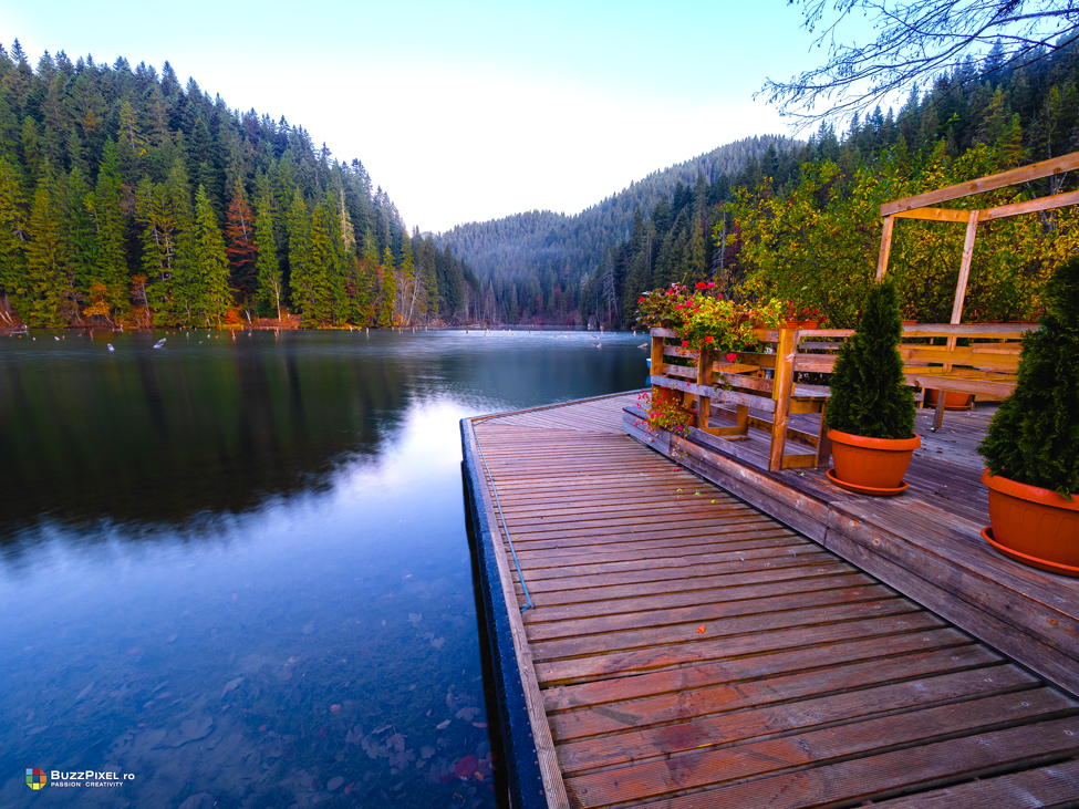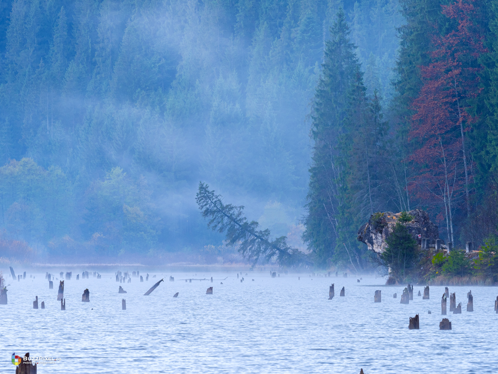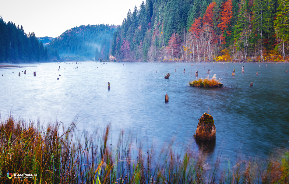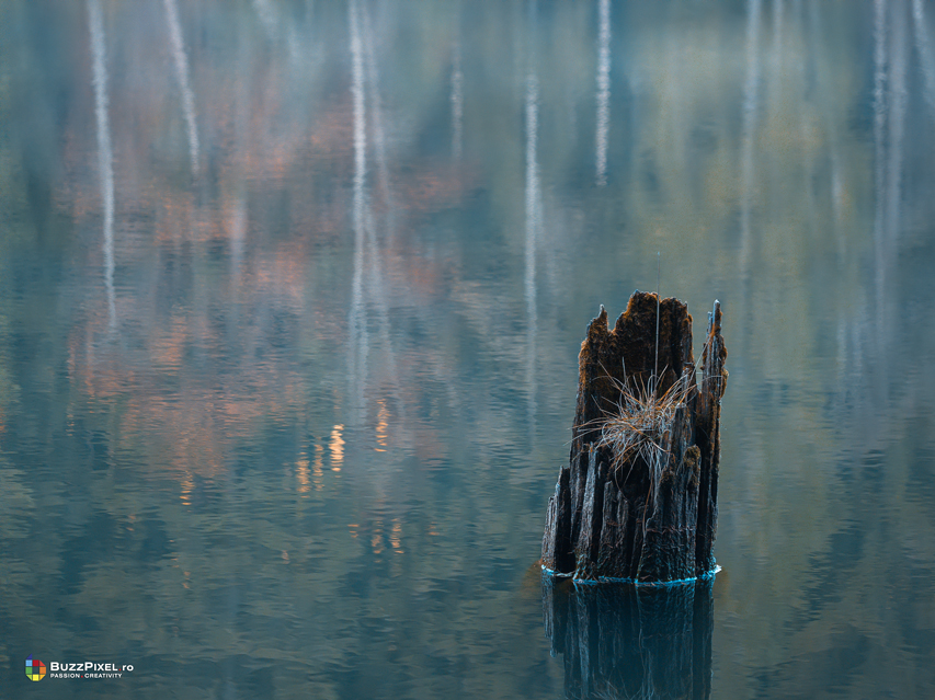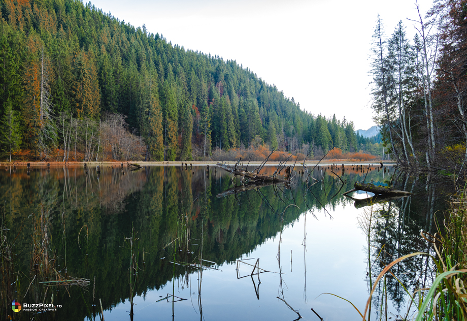 Am reusit sa surprindem culorile copacilor reflectati pe luciul apei dar si atmosfera diminetii de pe lac folosind aparatul foto profesionist Olympus E-M1X cu obiectivul 7-14mm f/2.8.